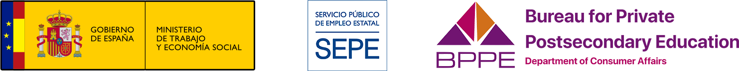 Centro autorizado por el Ministerio de Trabajo y Economía Social de España, el servicio público de empleo estatal y por el Bureau for Private Postsecondary Education (BPPE) del Estado de California.